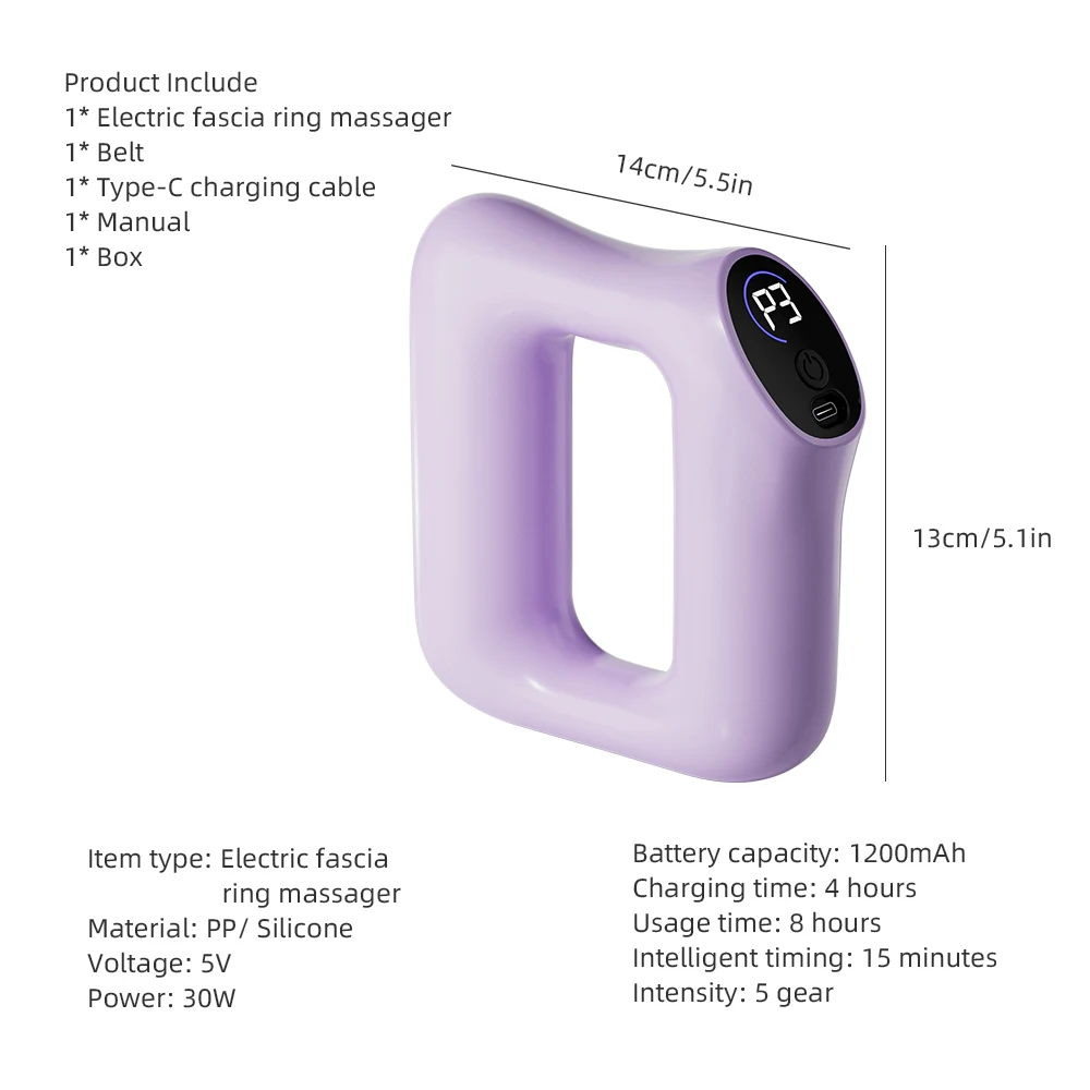 Discover the ultimate solution for muscle recovery and body contouring with this high-frequency fascia ring massager. Engineered with intelligent vibration technology across five intensity levels, it targets deep tissue tension in your shoulders, waist, and legs for effective muscle relaxation. The 1200mAh battery delivers up to 8 hours of continuous use on a single charge, while the 15-minute auto-timer ensures safe, controlled sessions. Lightweight and versatile with included belt attachment, this 30W powerhouse combines premium silicone construction with user-friendly design. Perfect for post-workout recovery, daily tension relief, or body shaping routines. Everything you need is included: massager, belt, Type-C charger, and detailed manual.