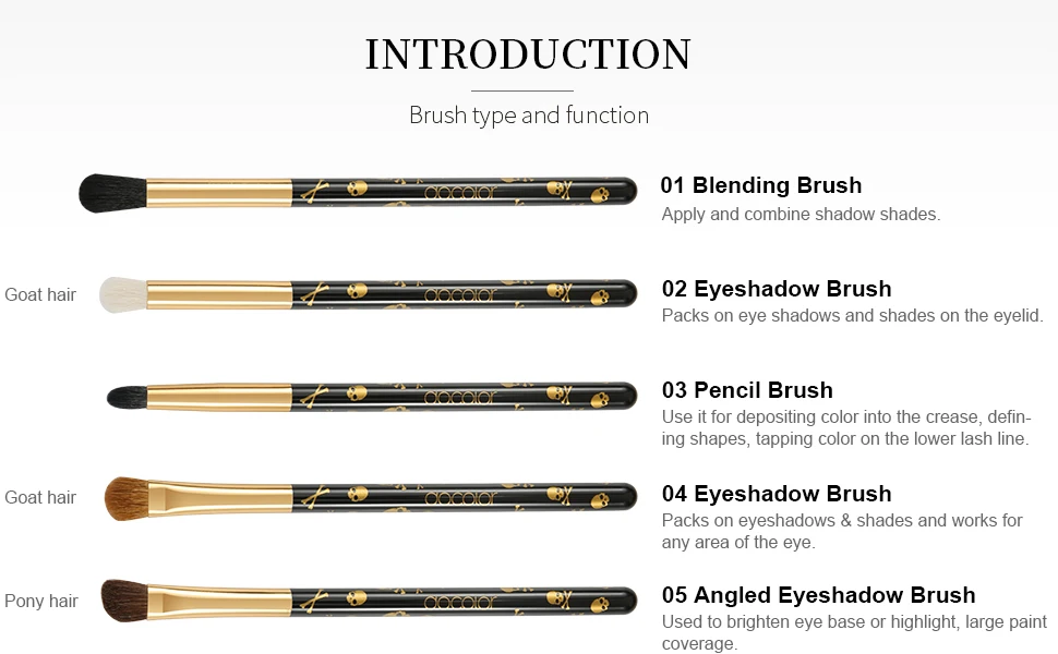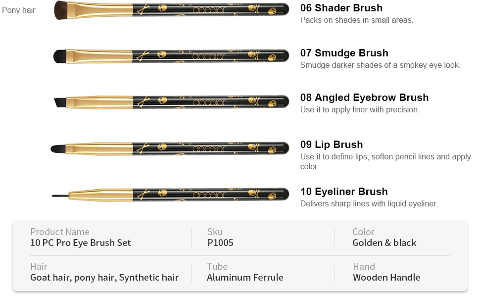 Discover the Docolor 10-piece Goth Eye Makeup Brush Set, your complete toolkit for flawless eye artistry. This professional-grade collection features premium synthetic and natural hair bristles paired with durable wooden handles and aluminum ferrules. From blending and eyeshadow application to precise eyeliner and eyebrow definition, each brush is expertly designed for its specific purpose. The soft, high-density bristles deliver seamless color payoff without shedding, while the varied shapes and sizes let you create endless makeup looks. Whether you're perfecting a smokey eye or defining your brows, this versatile set combines quality craftsmanship with everyday wearability for makeup enthusiasts at any skill level.